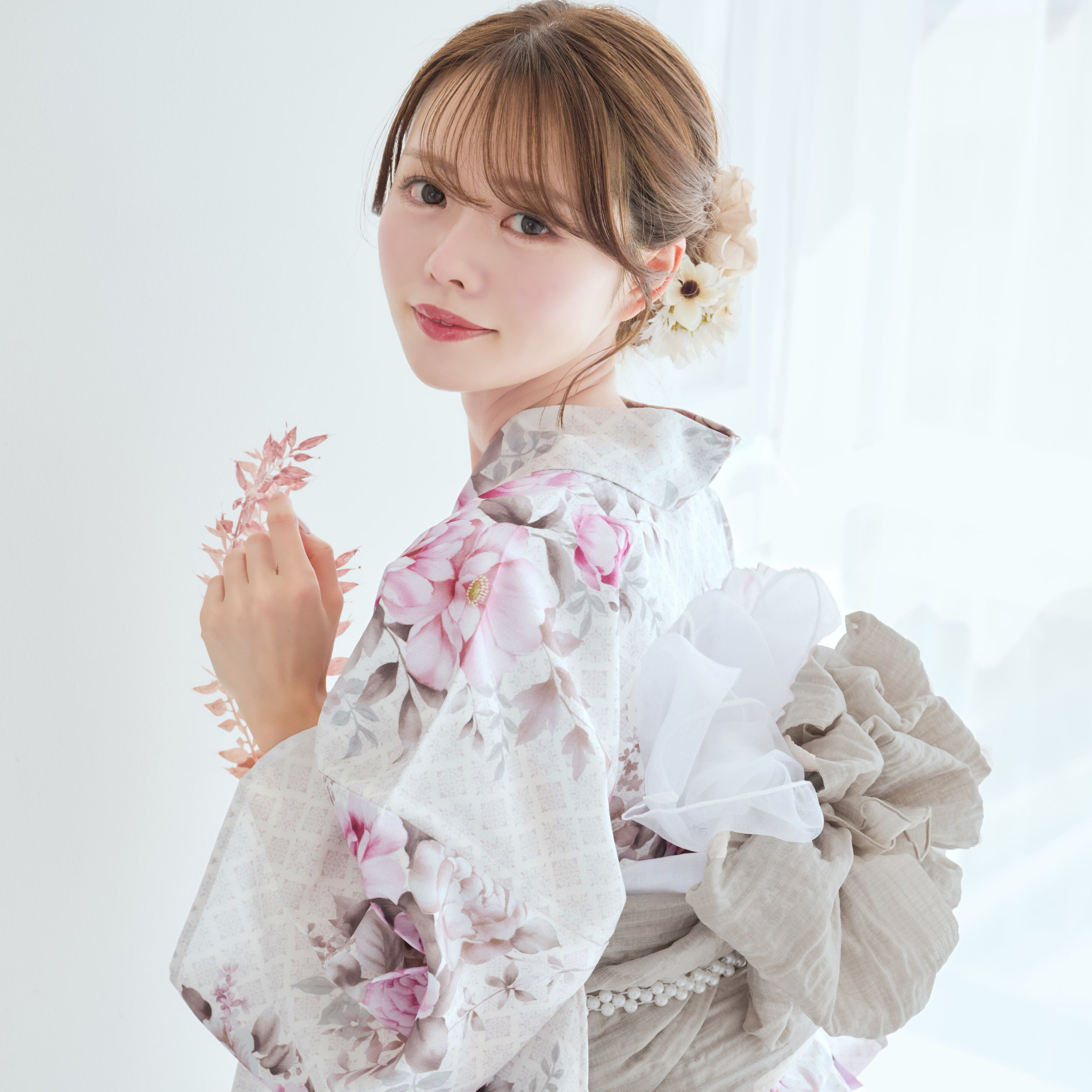 浴衣(白地×花柄)+兵児帯(ラメサンド)+腰ひも1本+1人で着られるガイドブックの4点セット