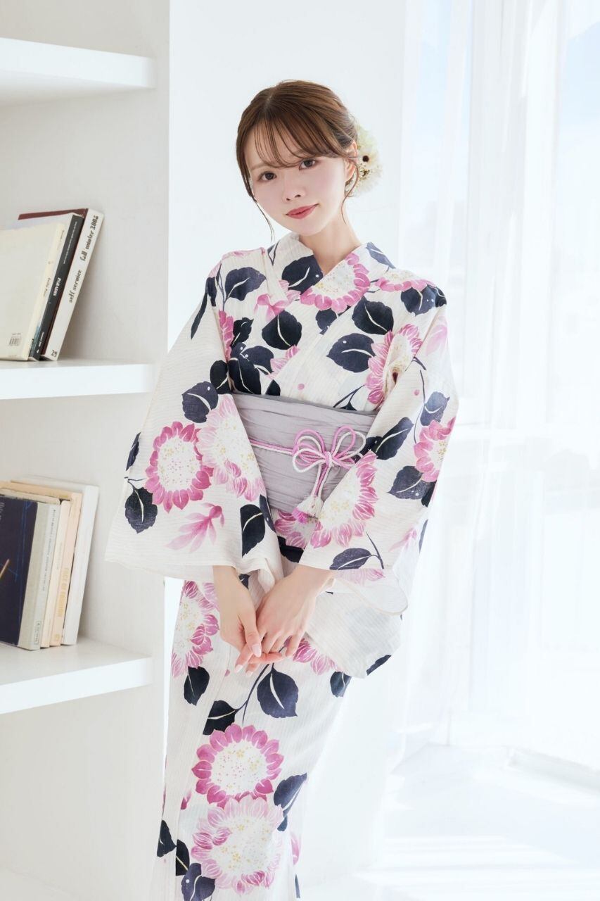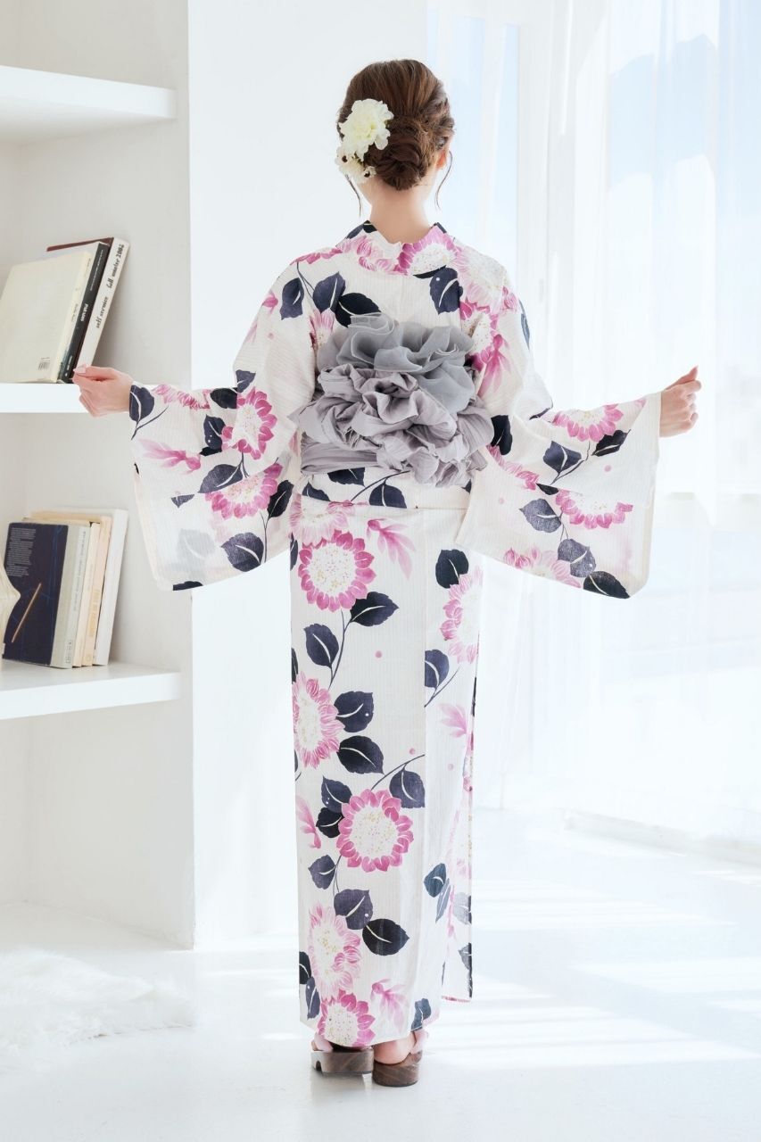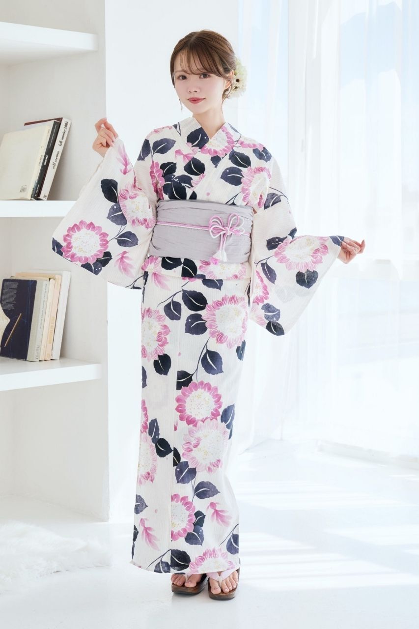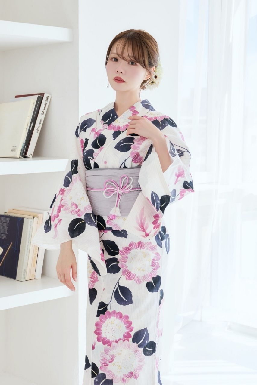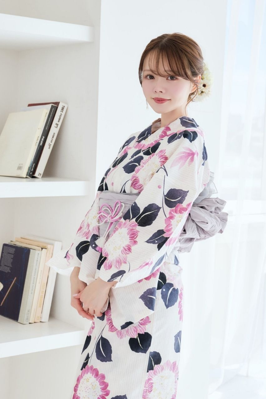 浴衣(向日葵&金魚柄)+兵児帯(ライトグレー)+腰ひも1本+1人で着られるガイドブックの4点セット