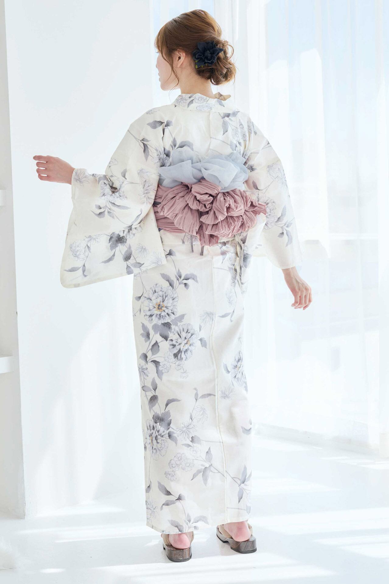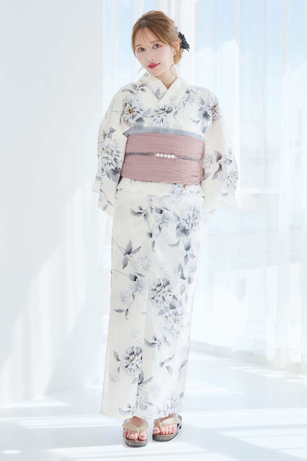 浴衣(白地×グレー花柄)+兵児帯(くすみピンク)+腰ひも1本+1人で着られるガイドブックの4点セット
