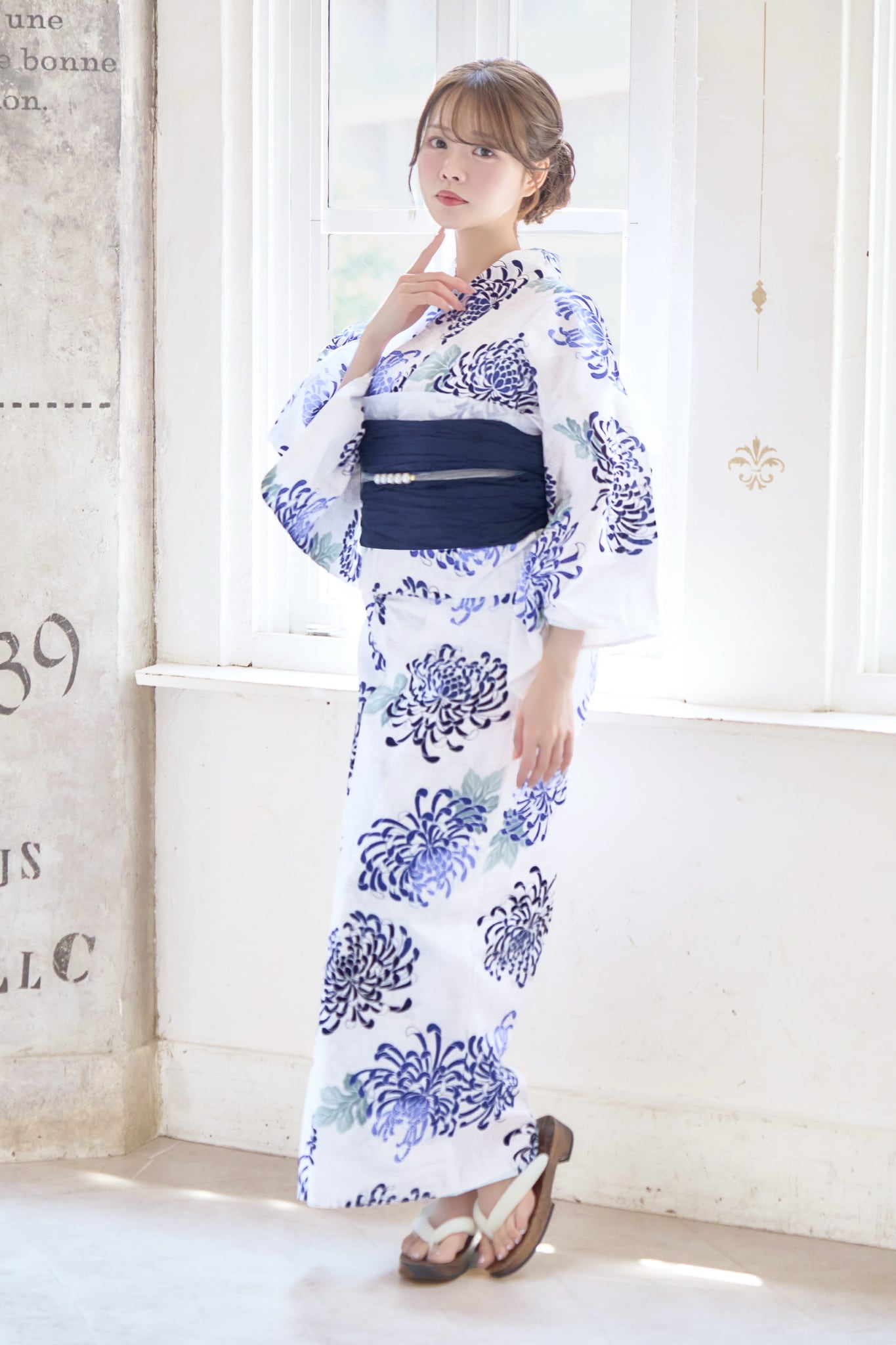 浴衣(白地)+兵児帯(ネイビー)+腰ひも1本+1人で着られるガイドブックの4点セット