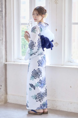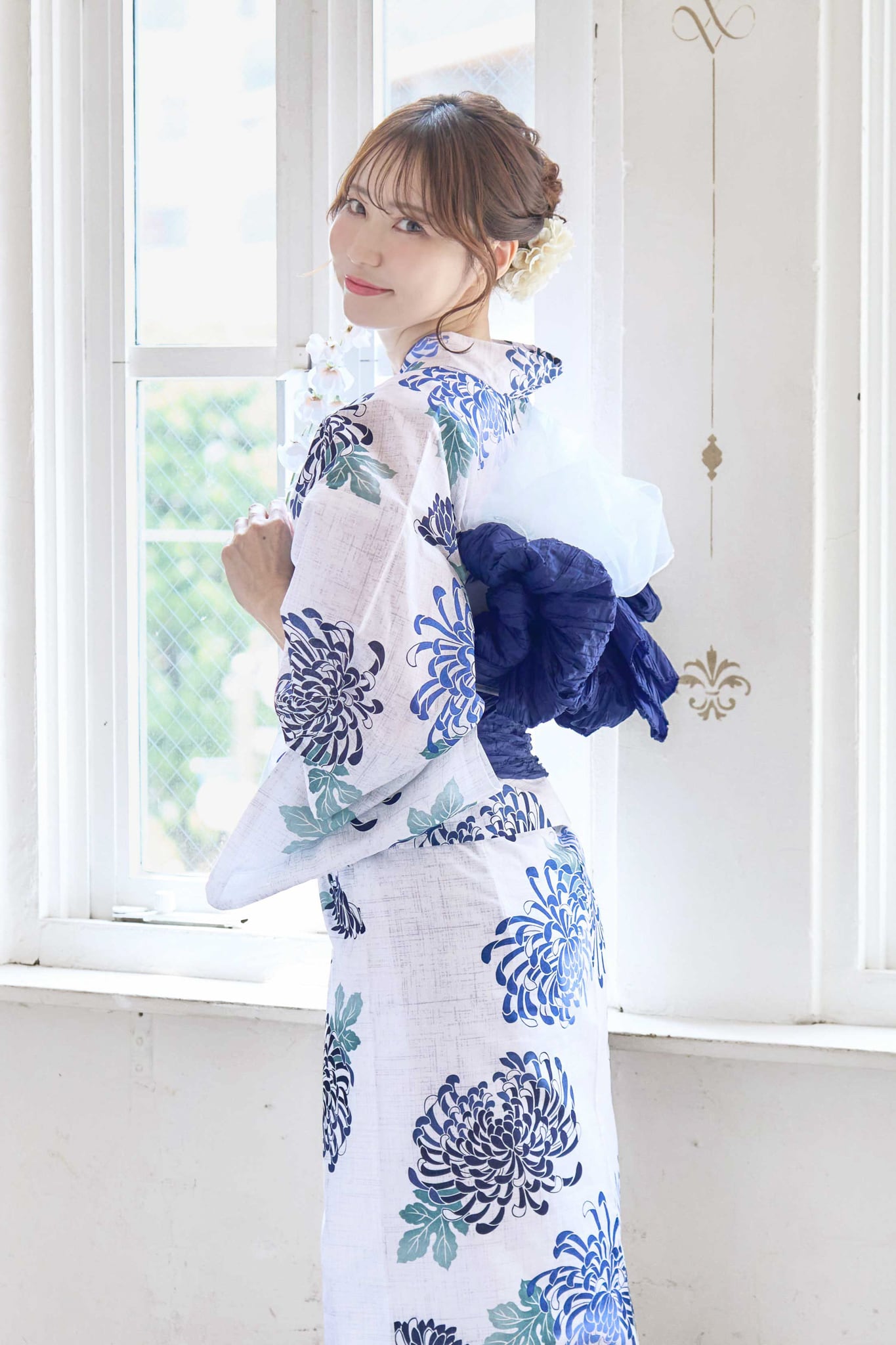 藍色の菊散らしの浴衣×兵児帯ネイビー