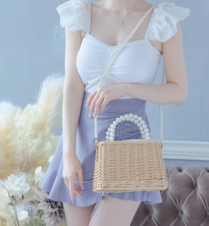 取っ手とショルダー紐がパールになっているかごバッグです。