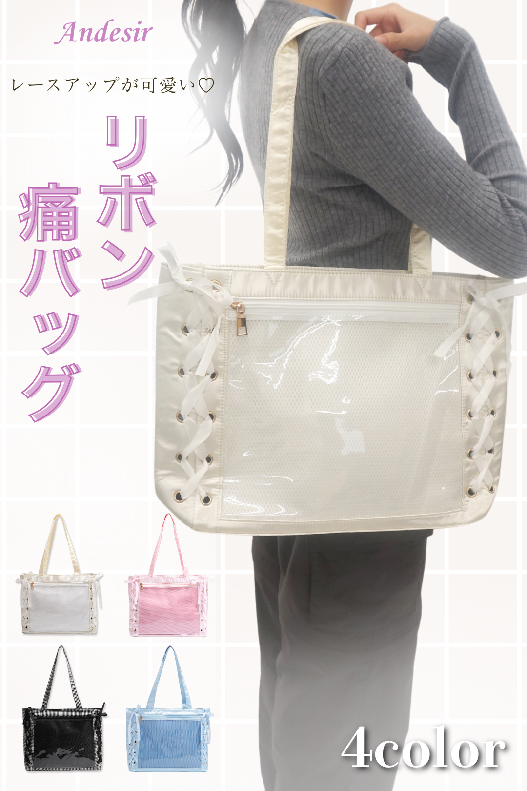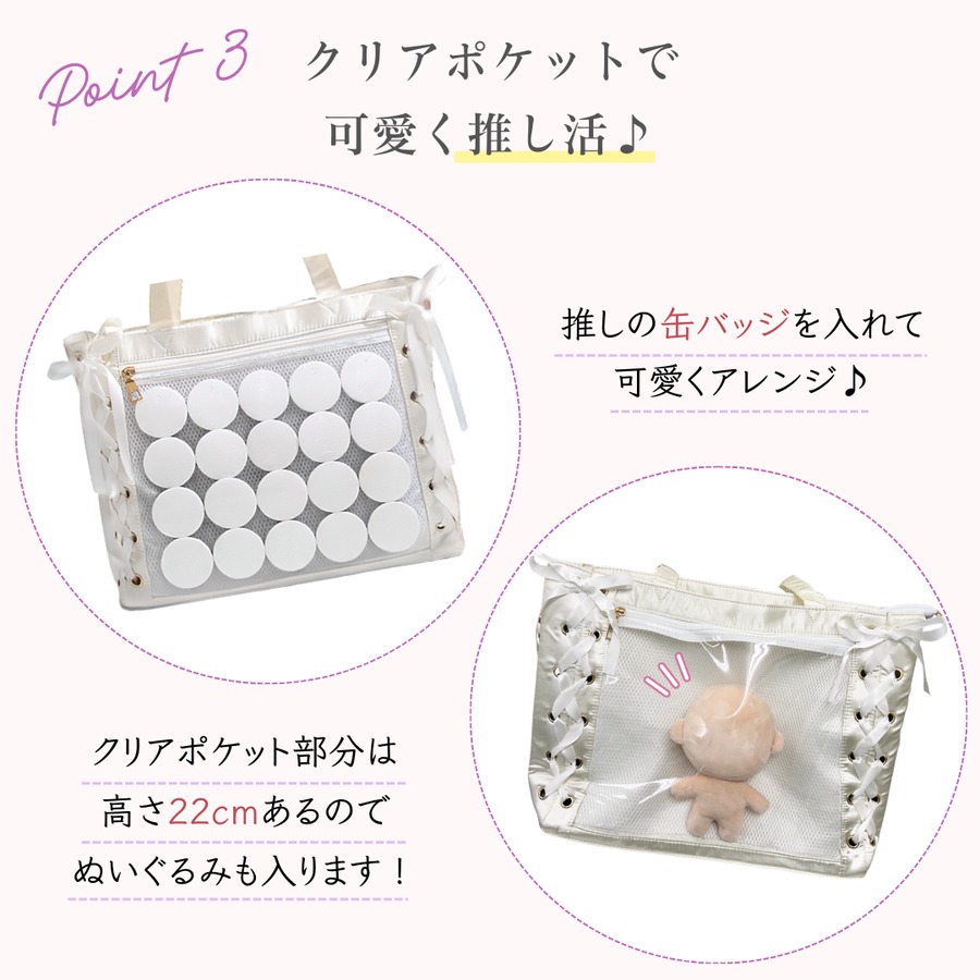 リボンの編み上げが可愛いトートタイプの痛バッグです♪ クリアポケットは自分好みにアレンジして可愛く推し活が出来ます!