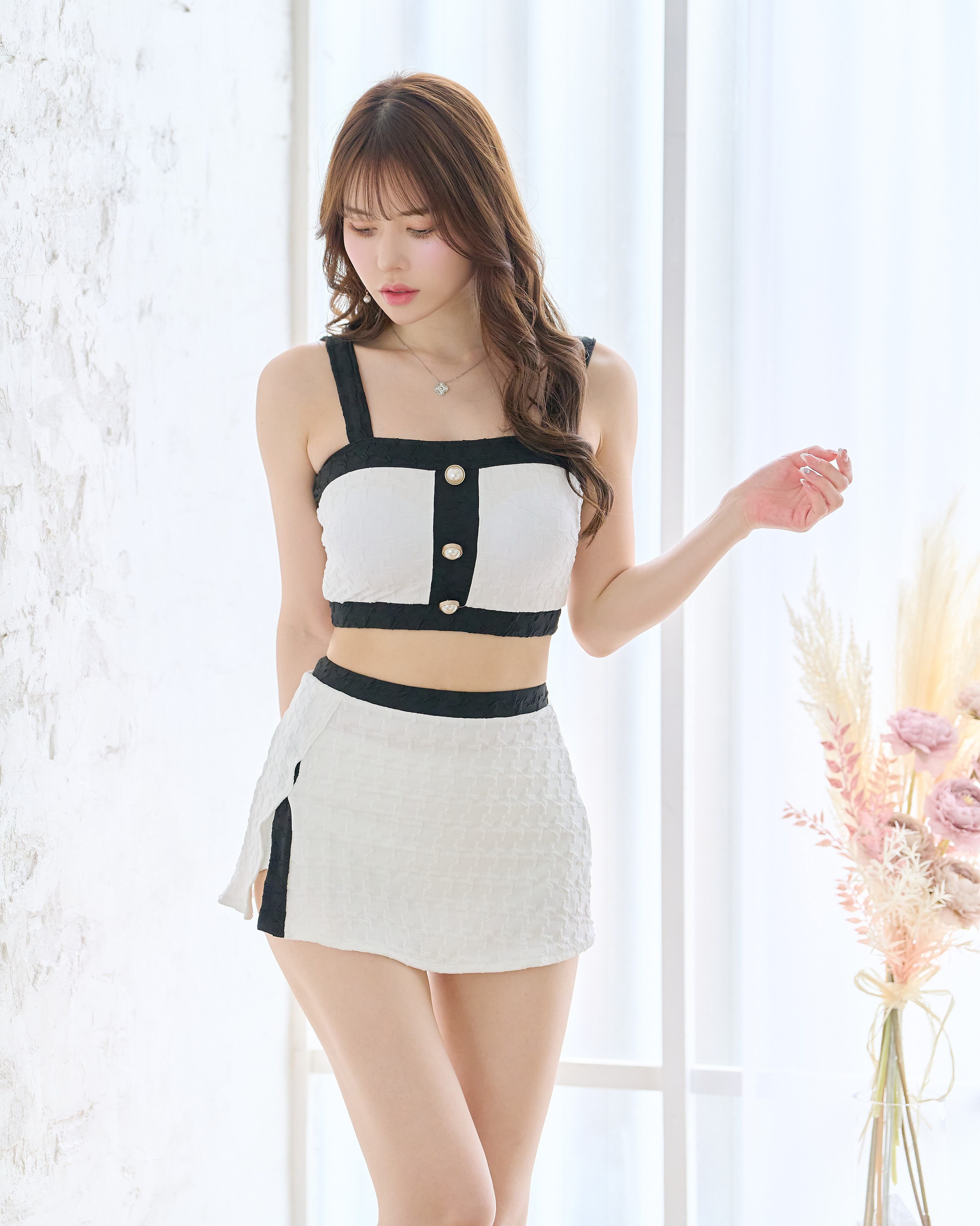 3点セットパールボタン×パイピングスカート水着☆ホワイト i22