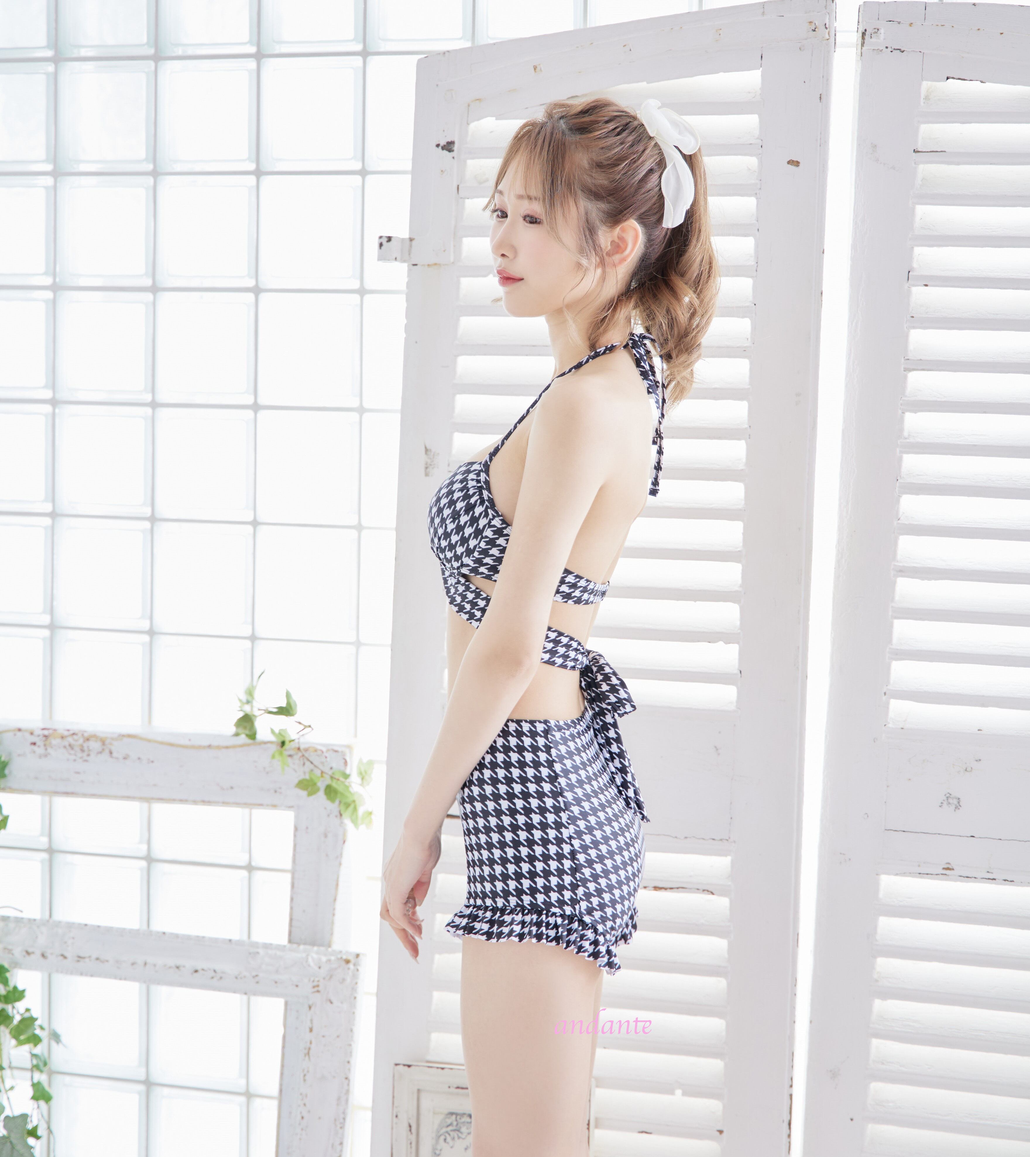 ワイヤー入り盛れる千鳥柄クロス水着☆ショートパンツ(ホルターネック) B22