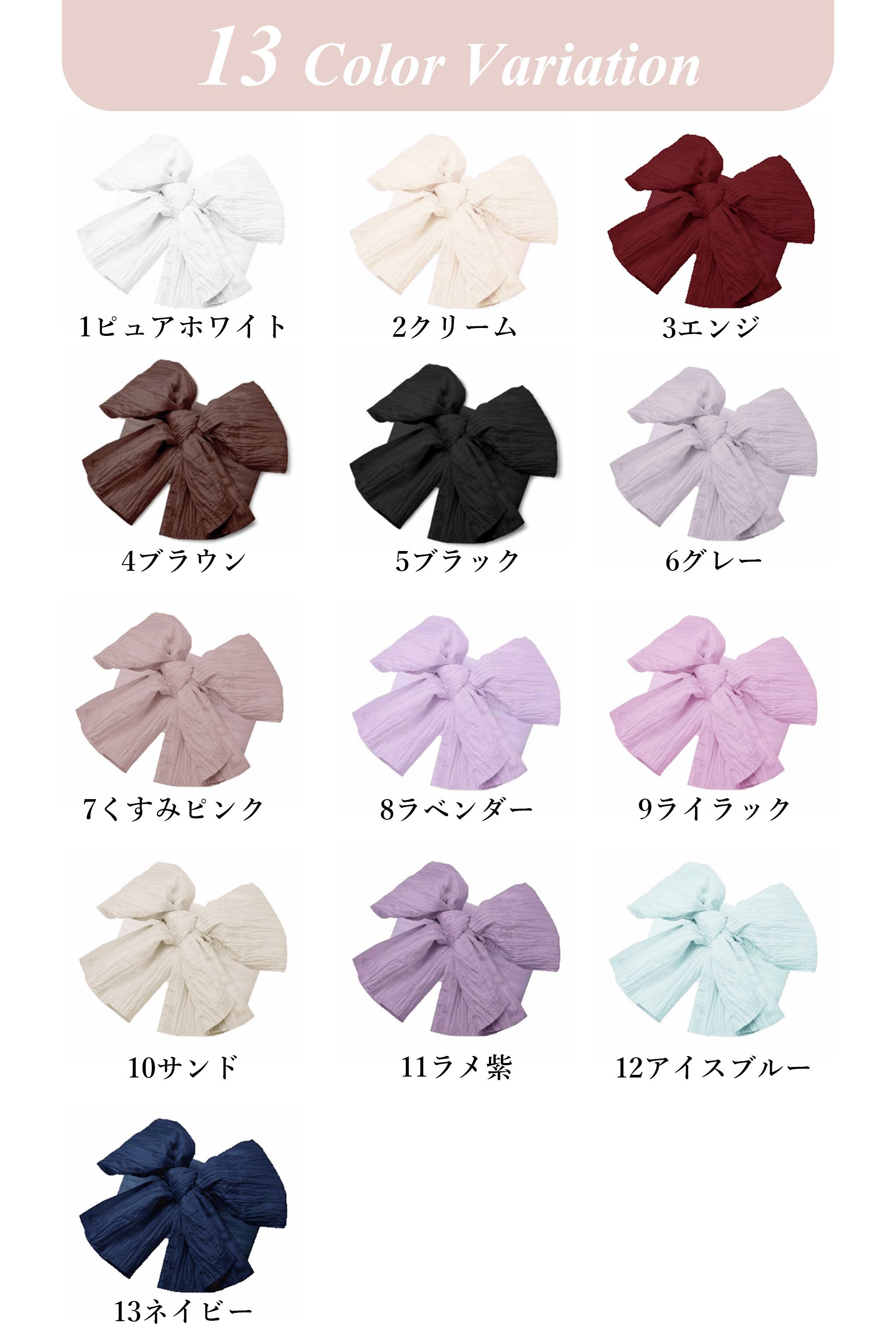 しわ加工が適度な立体感を作りだしてくれるので、お花のようにふんわり、ボリューム感たっぷりに仕上げたり、さらっと結んで大人っぽく仕上げたり、アレンジは自由自在。
