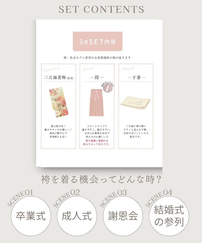 内容は【着物・袴・下帯・着付けガイドブック】の④点セットです。