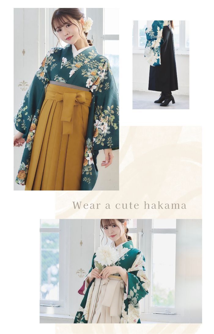 袴は、中仕切りがない行灯袴ですので、洋服のスカートと同じようにお召しいただけます。ご自宅でもお手入れしやすいので、着用も安心です。着崩れ防止の、便利なヘラ付きです。