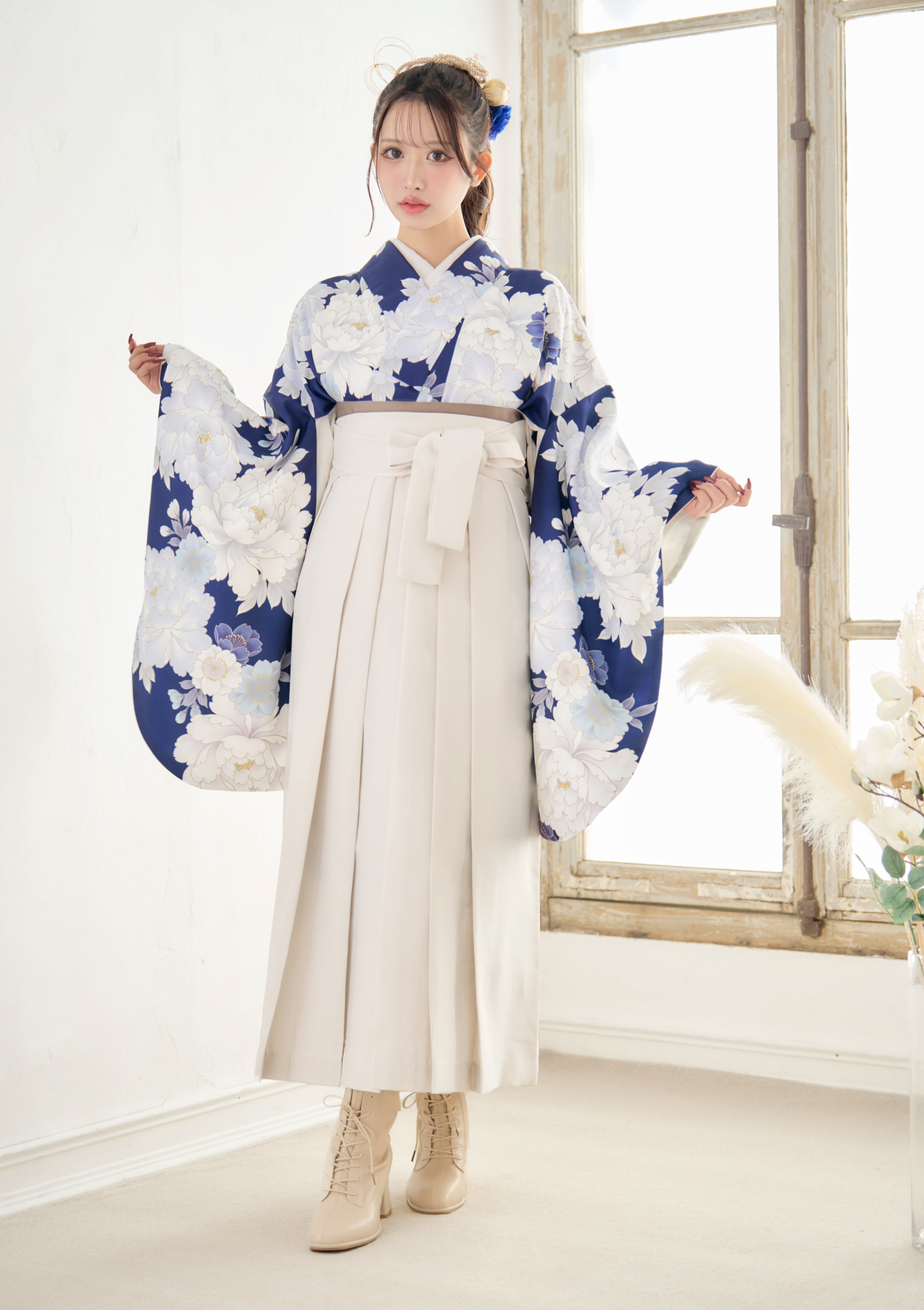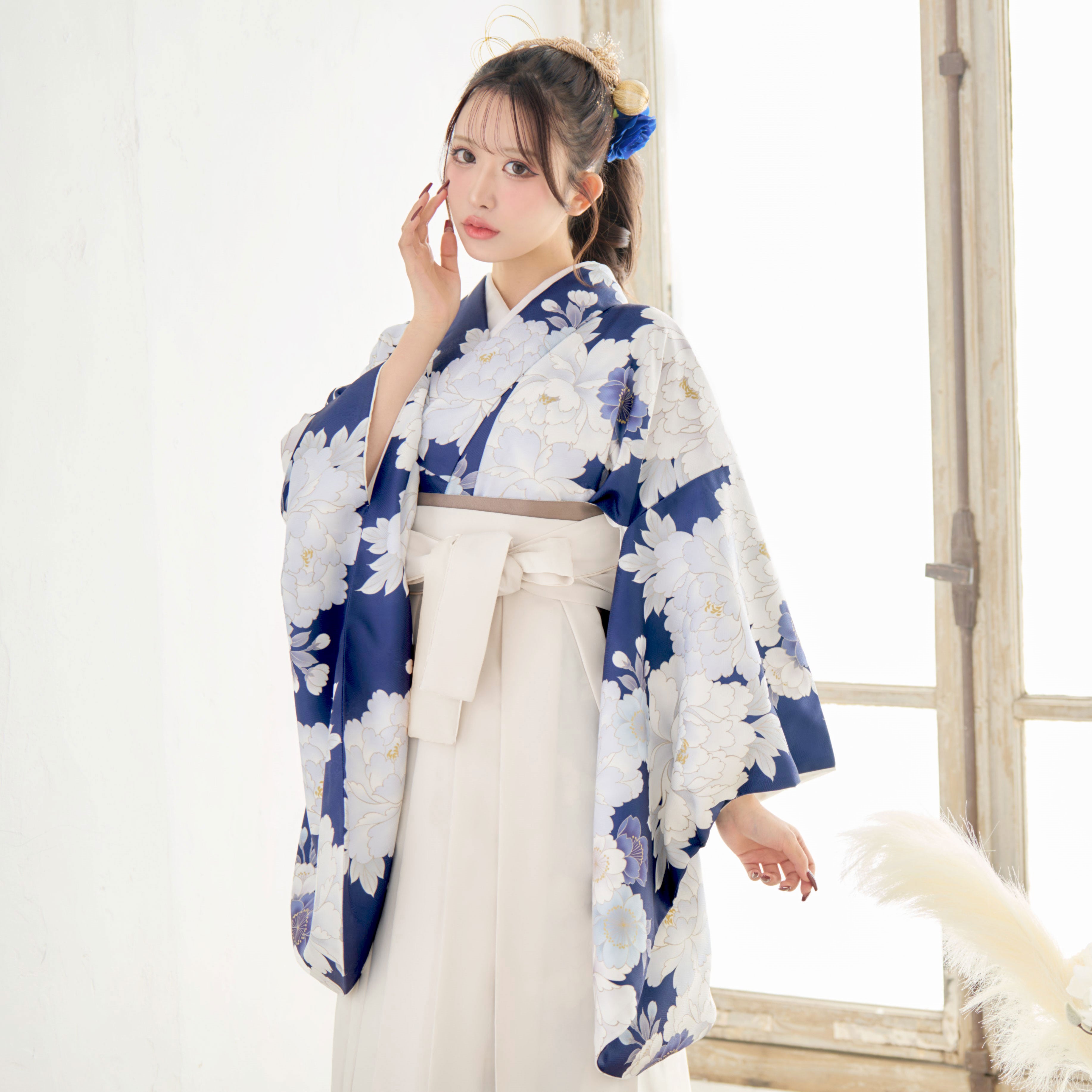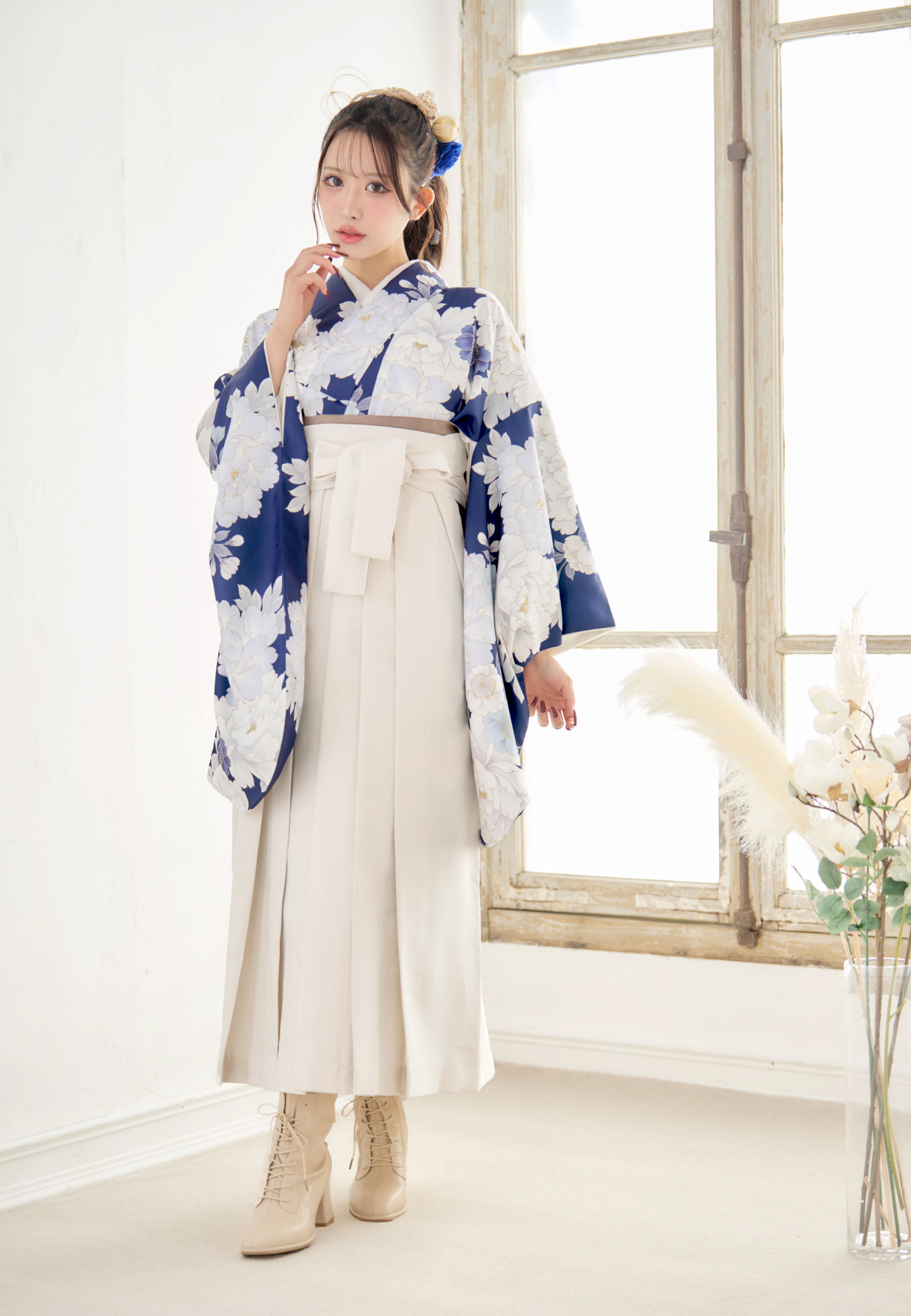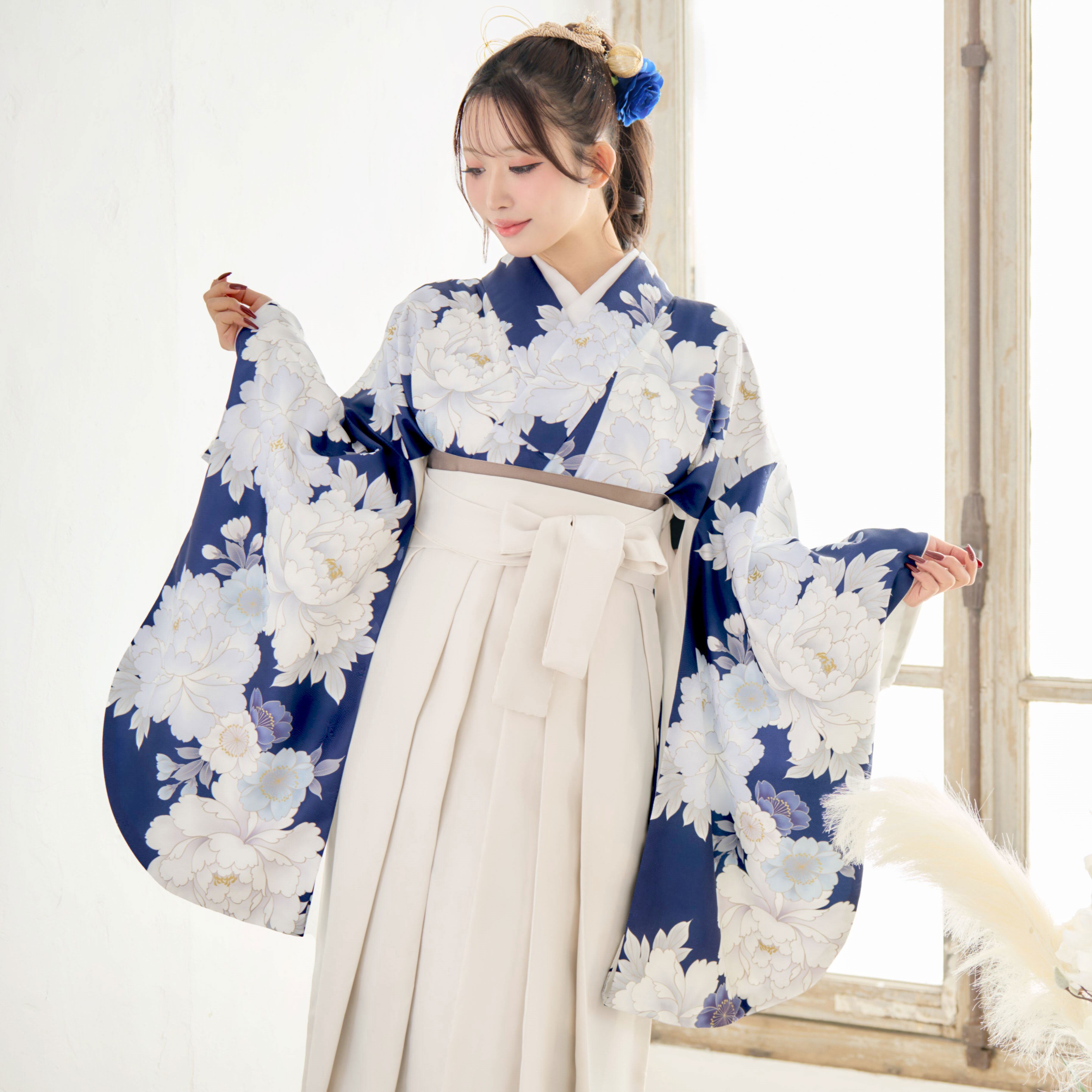 【袴4点set】華やかに咲く春のぼたん(青)85BK/WH