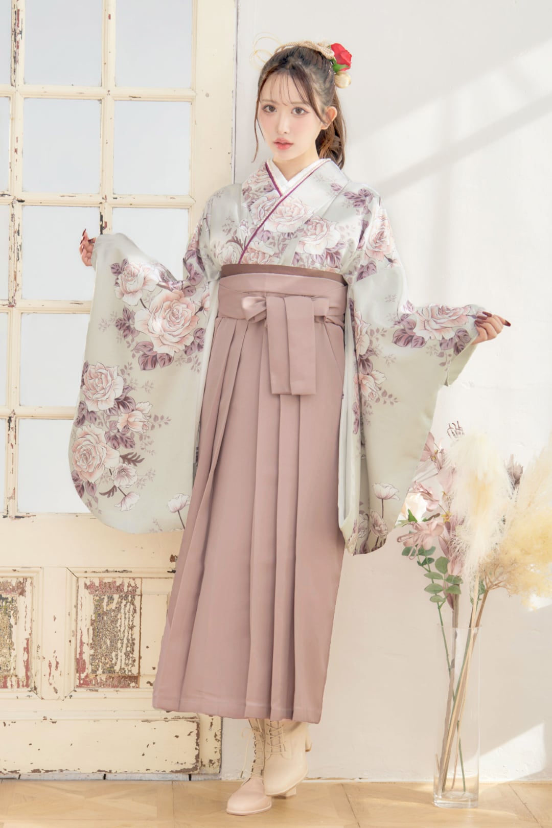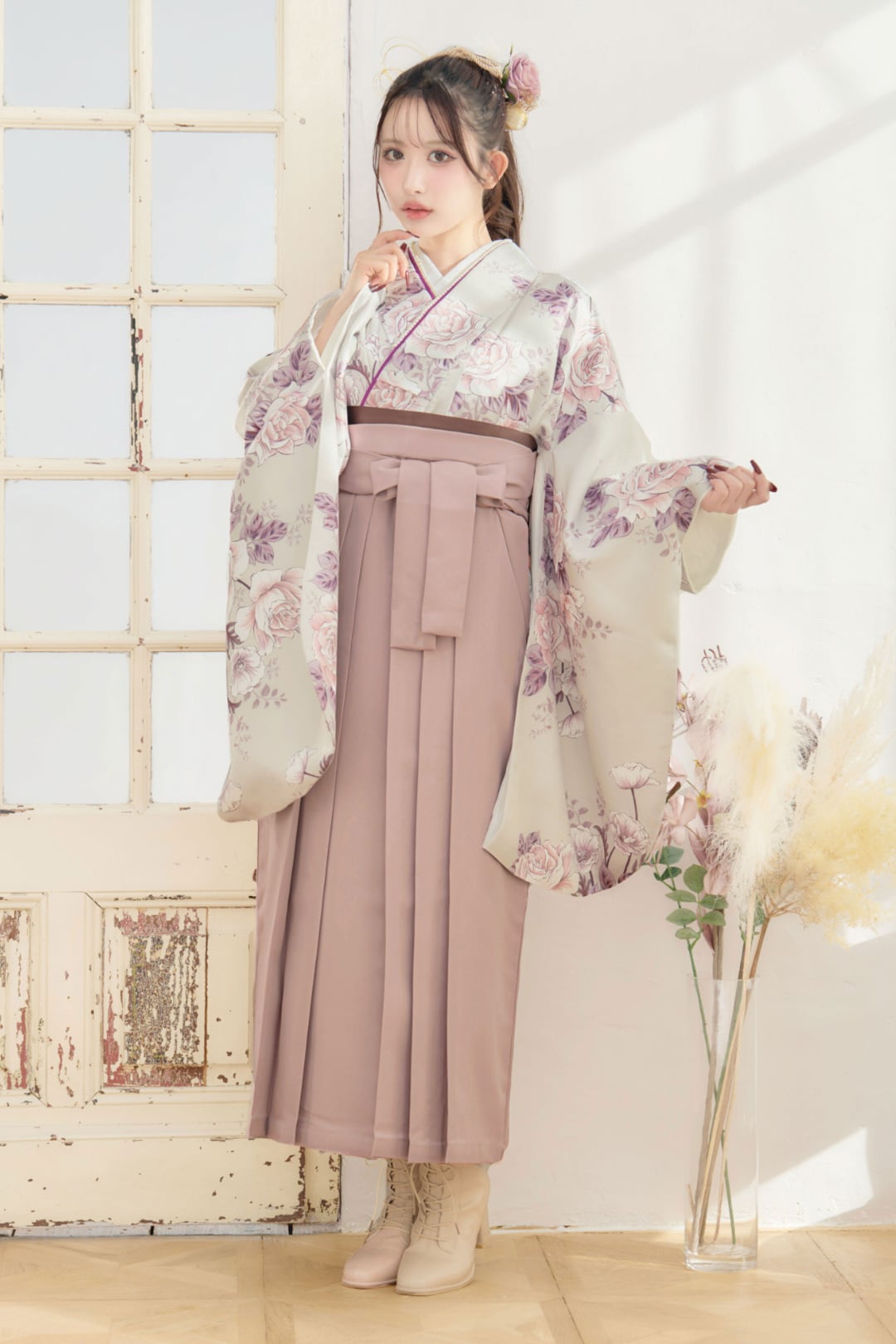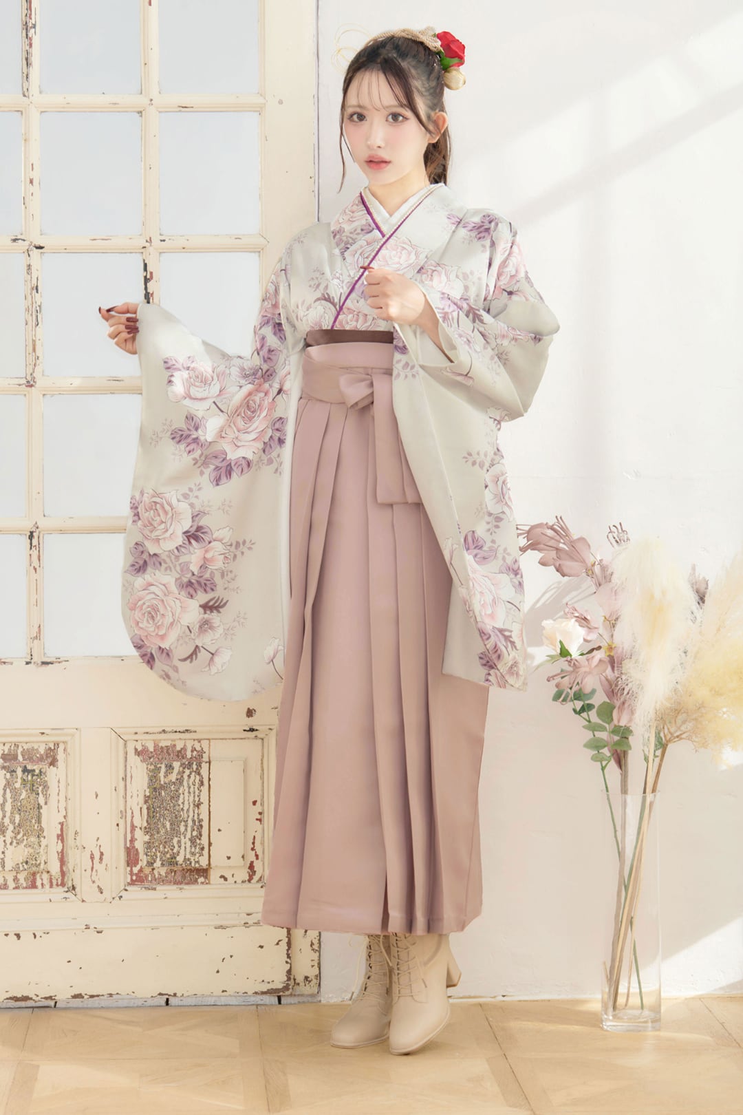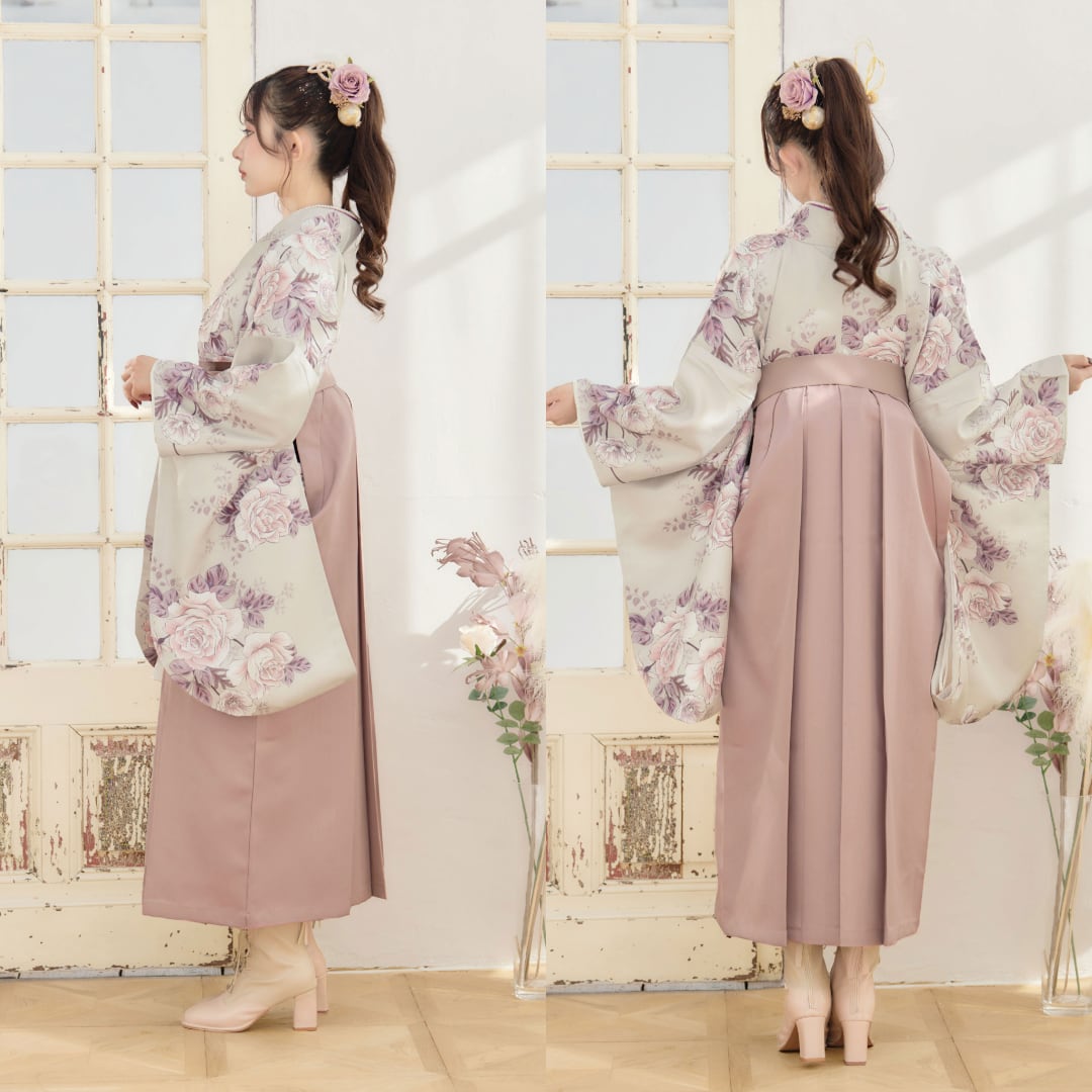 【袴4点set】乙女色のアンティークローズ(グレージュ地)88MPK/BK