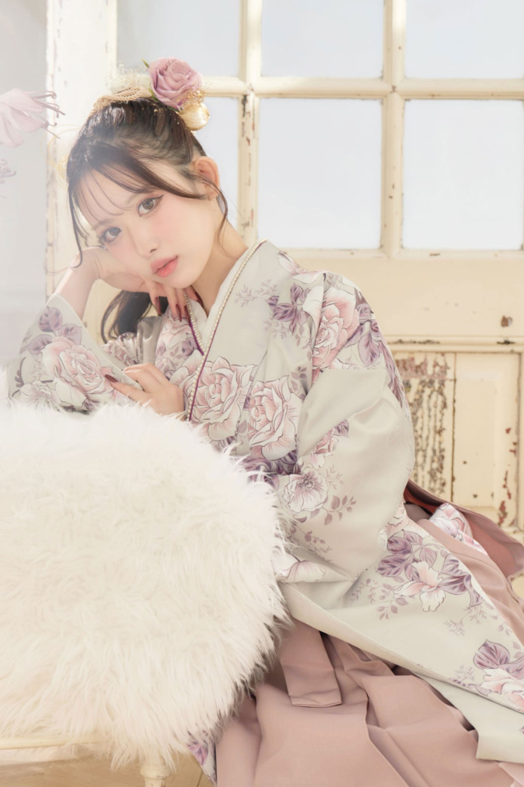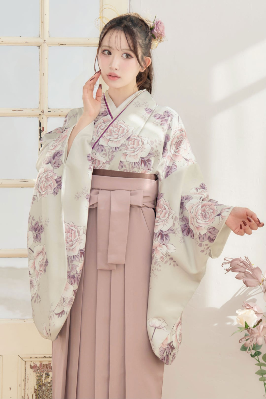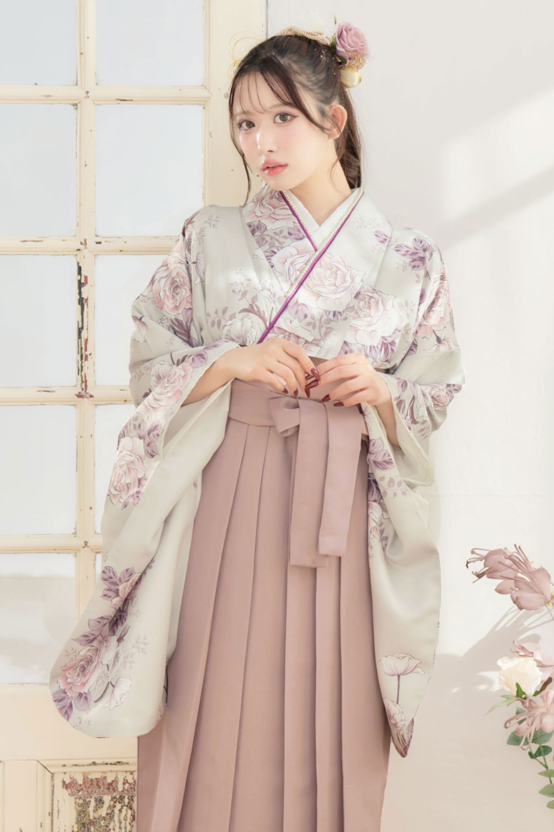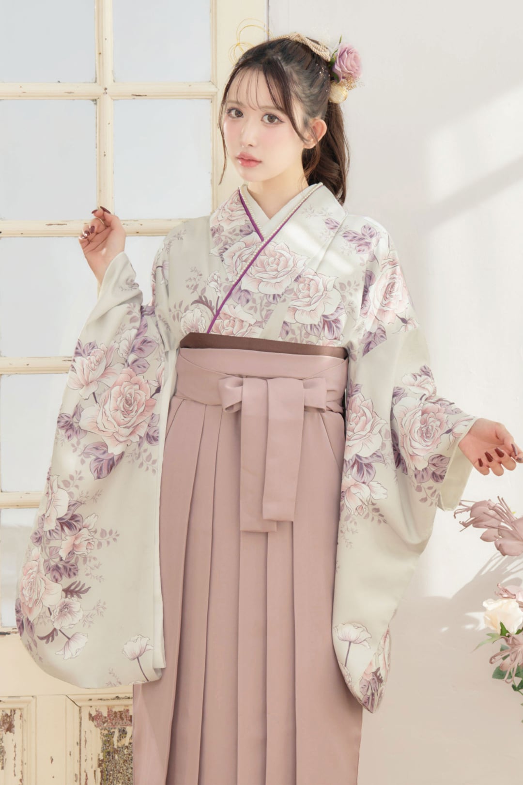 【袴4点set】乙女色のアンティークローズ(グレージュ地)88MPK/BK